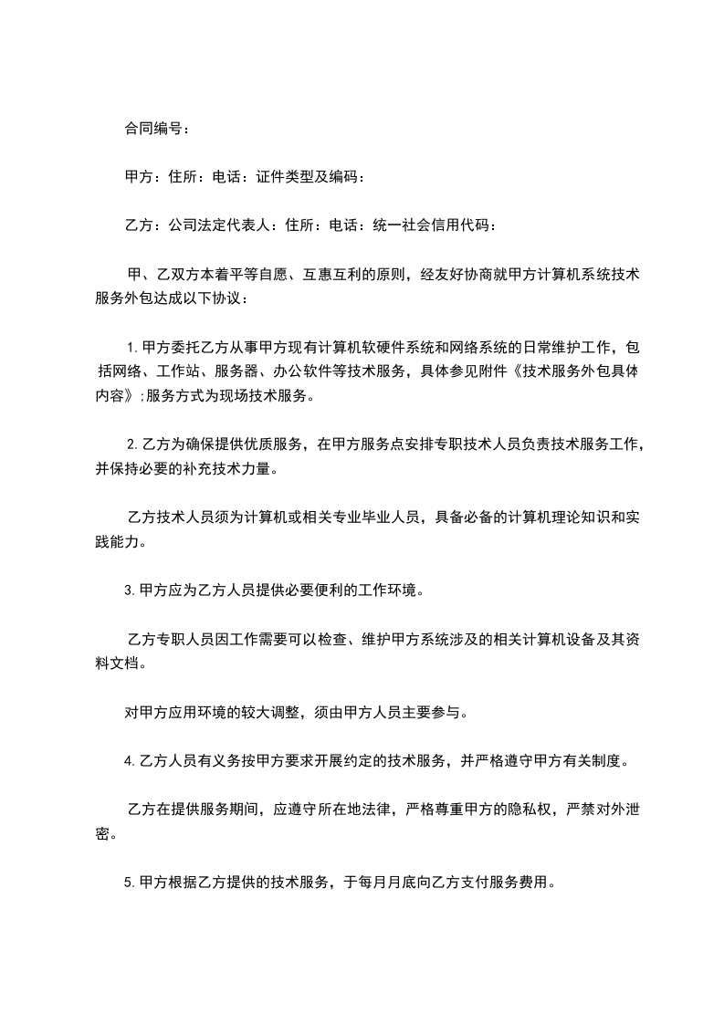 甲、乙双方本着平等自愿、互惠互利的原则,经友好协商就甲方计算机系统技术服务外包达成以下协议: