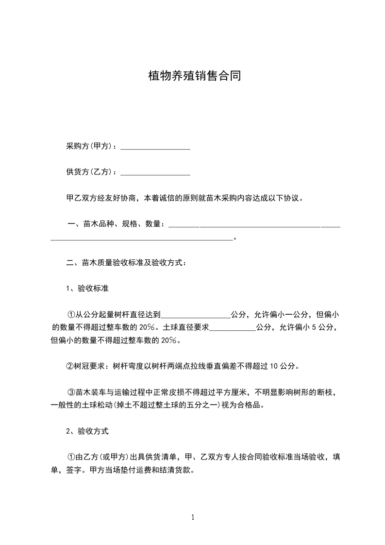 第三条甲方提供种苗的数量、时间和方式为_______________________________________。种苗应满足的条件为:__________________________________________________________________。对种苗验收的方式为:_______________________________________。种苗价格为____元/____(单位),合计:____元,价