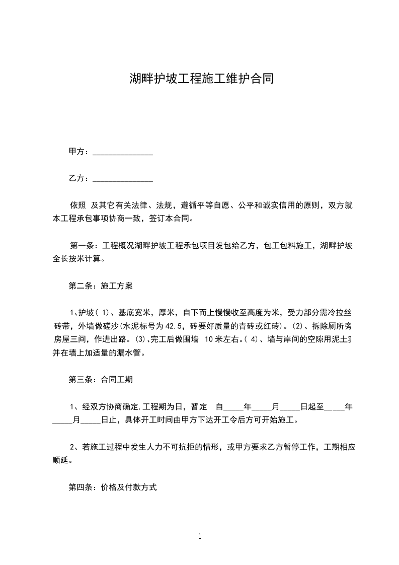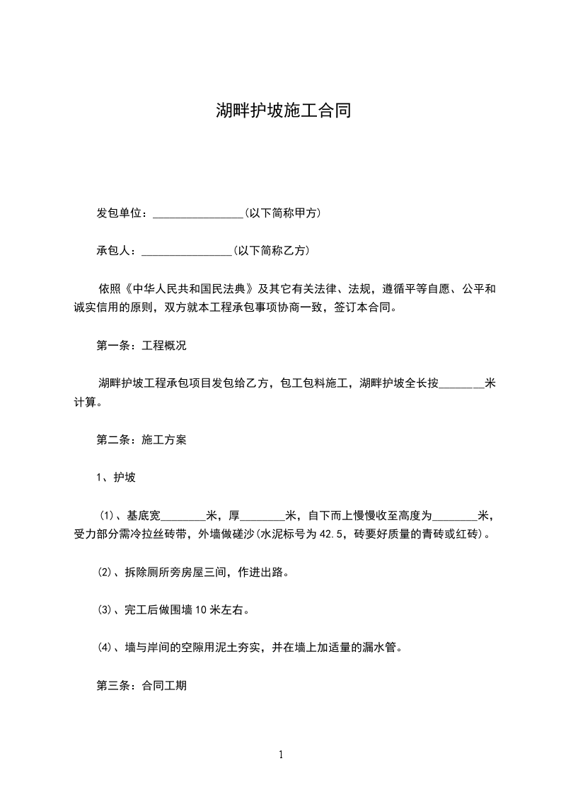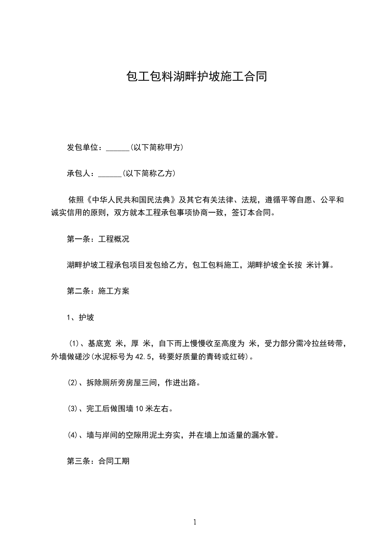 湖畔护坡工程承包项目发包给乙方,包工包料施工,湖畔护坡全长按________米计算。