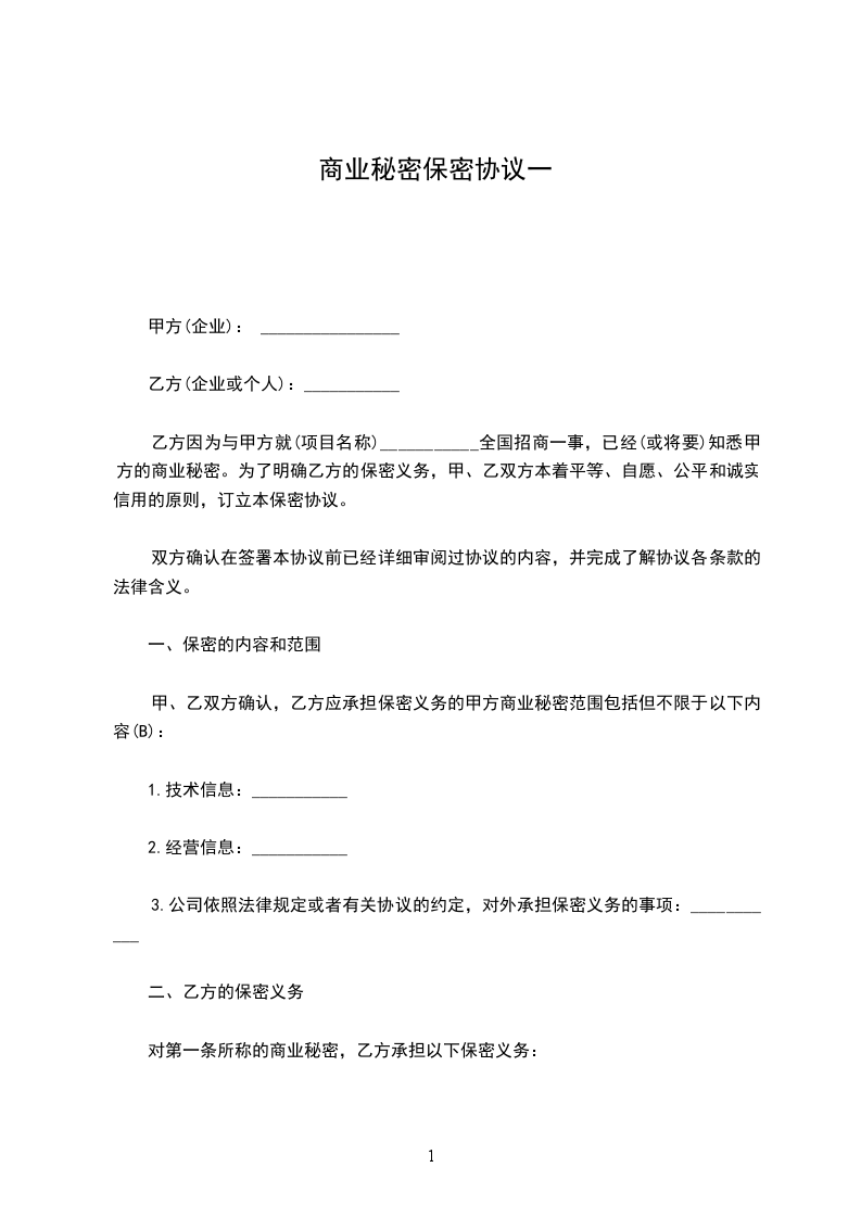 乙方因为与甲方就(项目名称)___________全国招商一事,已经(或将要)知悉甲方的商业秘密。为了明确乙方的保密义务,甲、乙双方本着平等、自愿、公平和诚实信用的原则,订立本保密协议。