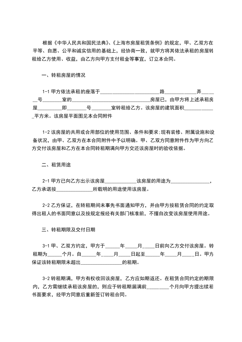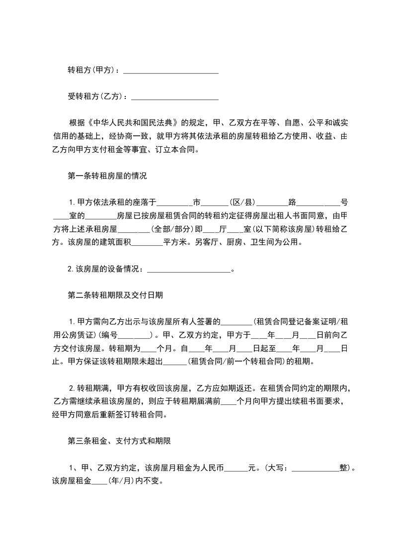 乙方承租甲方房屋,并同意转租________市________________的房屋与丙方,并同意将其在原有房屋租赁合同中合法享有的全部权利义务一并转让与丙方。