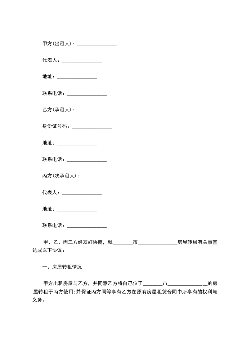 甲、乙、丙三方经友好协商,就________市________________房屋转租有关事宜达成以下协议: