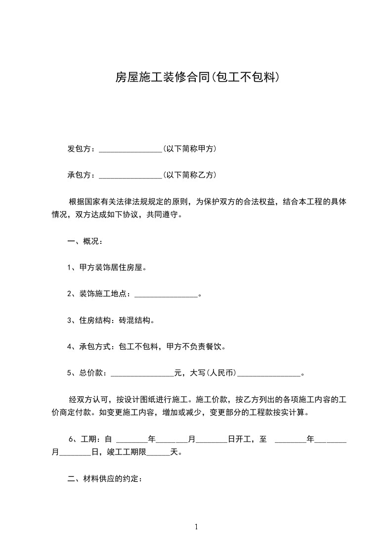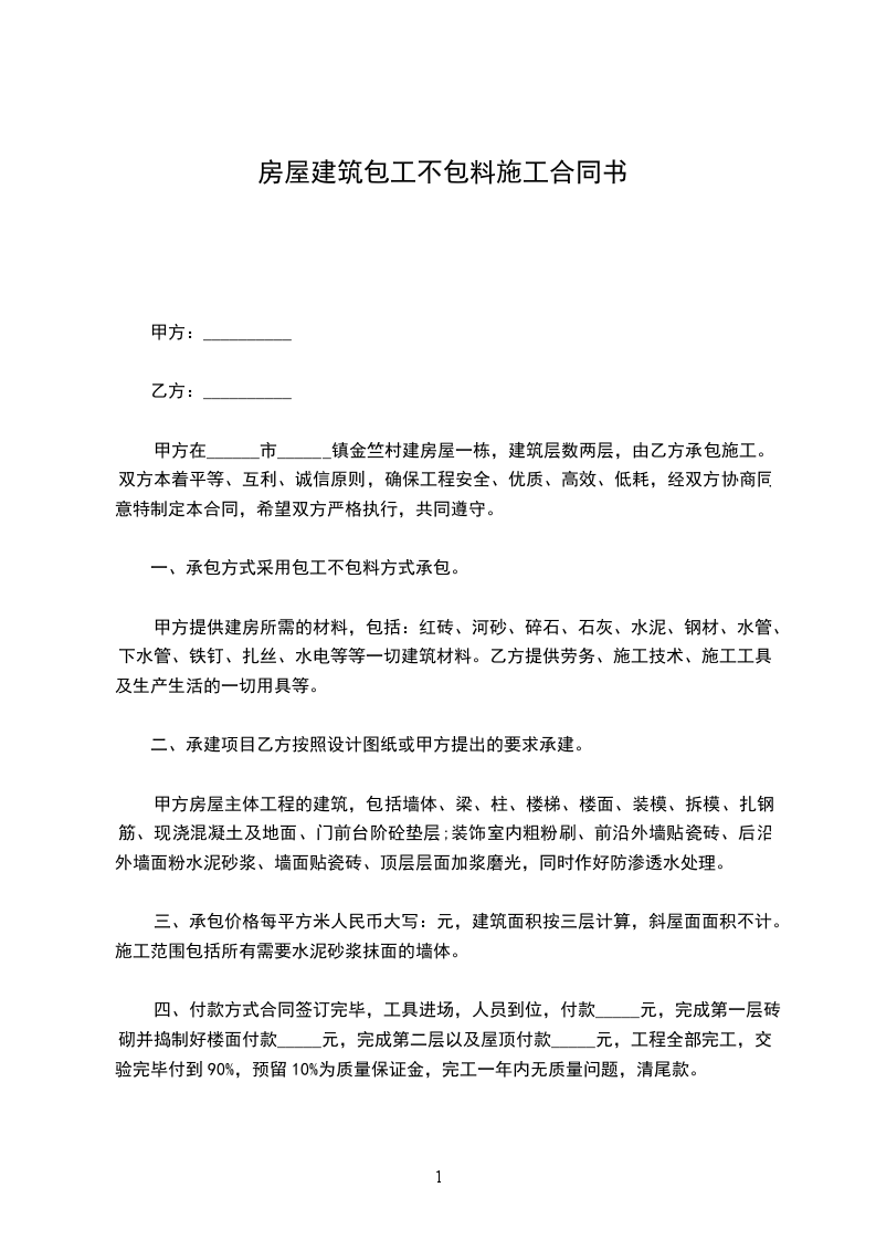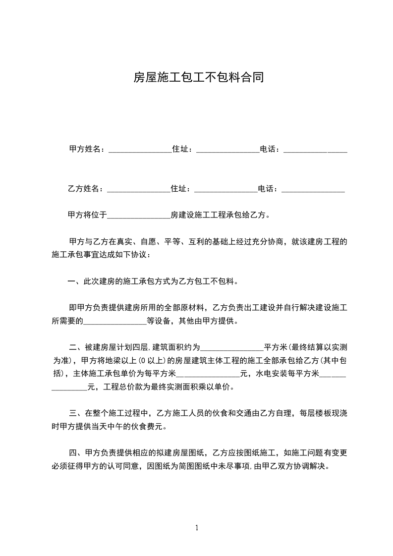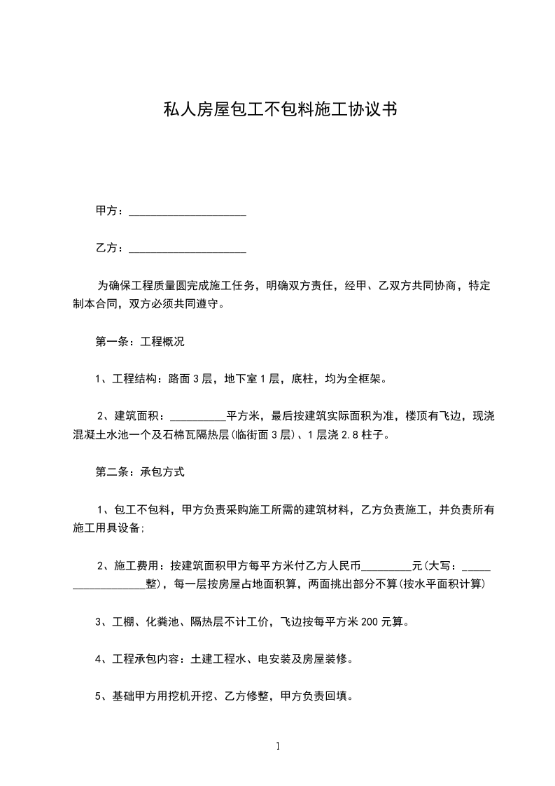 一、此次建房的施工承包方式为乙方包工不包料。