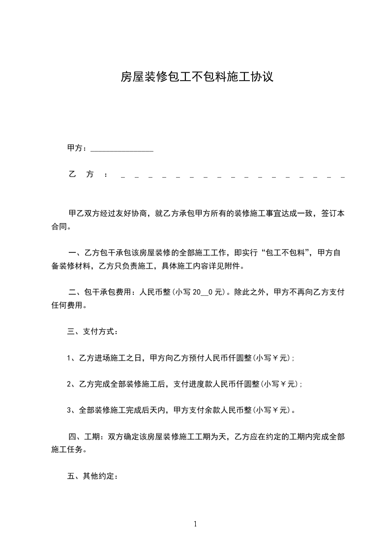 2、乙方应按约定工期完工,如因乙方原因造成工期拖延的,拖延15天以上,每天每平方米减少工钱________________元。
