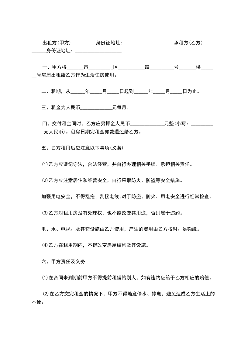 一、甲方将_______市__________区___________路__________号_______楼_______号房屋出租给乙方作为生活住房使用。