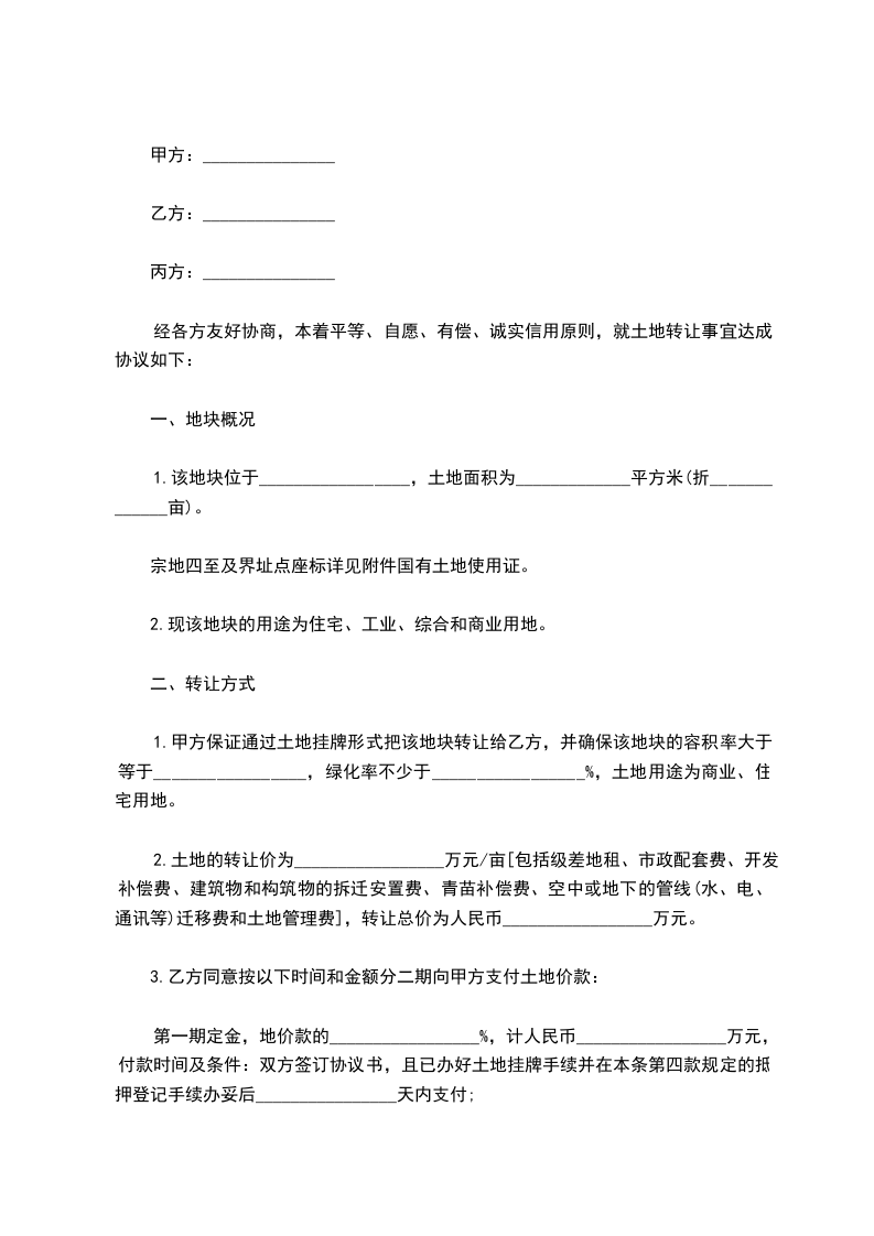 经各方友好协商,本着平等、自愿、有偿、诚实信用原则,就土地转让事宜达成协议如下: