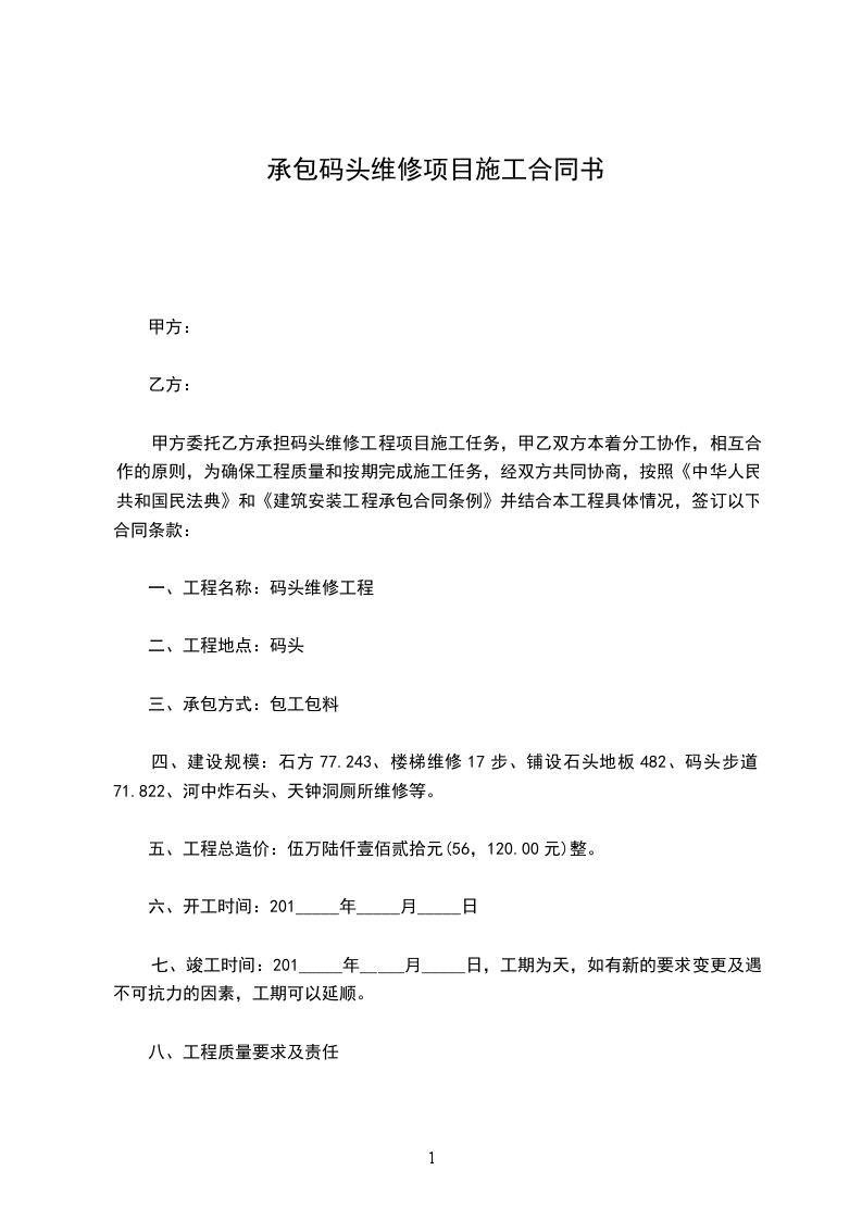 甲方委托乙方承担码头维修工程项目施工任务,甲乙双方本着分工协作,相互合作的原则,为确保工程质量和按期完成施工任务,经双方共同协商,按照《中华人民共和国民法典》和《建筑安装工程承包合同条例》并结合本工程具体情况,签订以下合同条款: