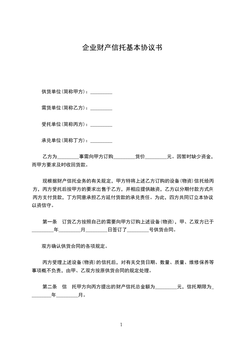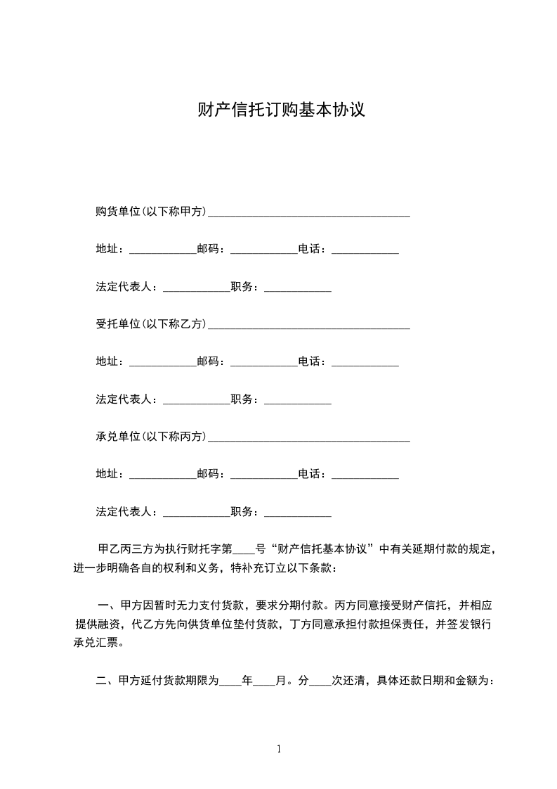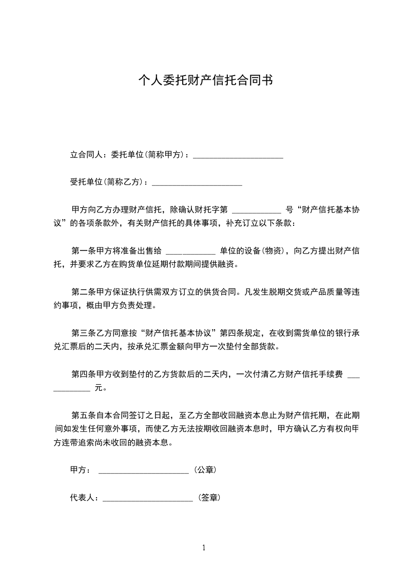 第一条甲方将准备出售给_____单位的设备(物资),向丙方提出财产信托,并要求丙方在购货单位延期付款期间提供融资。