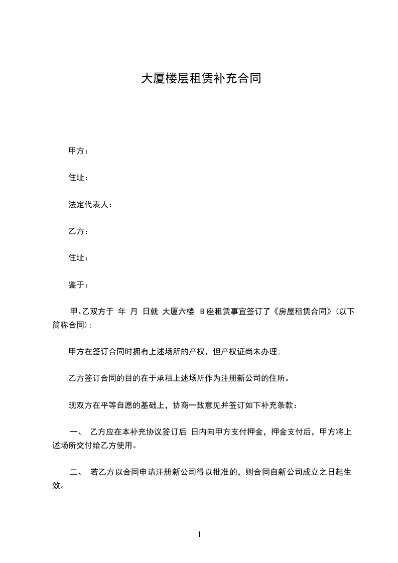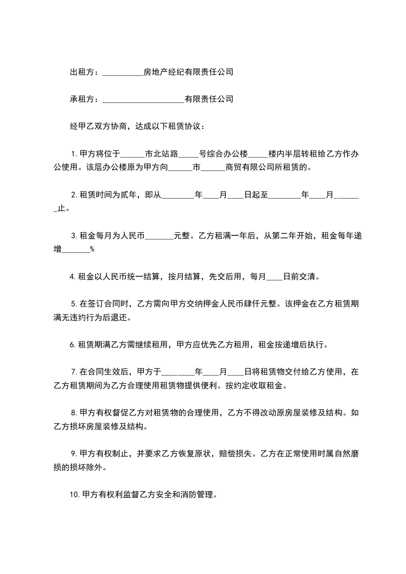 1.甲方将位于______市北站路_____号综合办公楼_____楼内半层转租给乙方作办公使用。该层办公楼原为甲方向______市______商贸有限公司所租赁的。