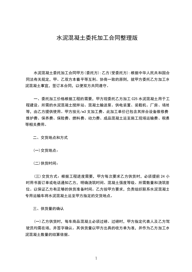 1.甲方委托乙方加工混凝土,具体规格、型号及数量以甲方每次下达的加工订单为准。