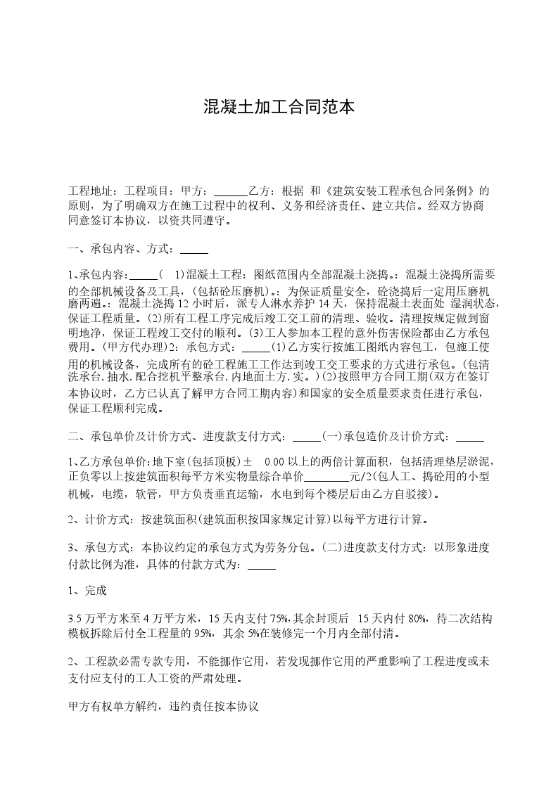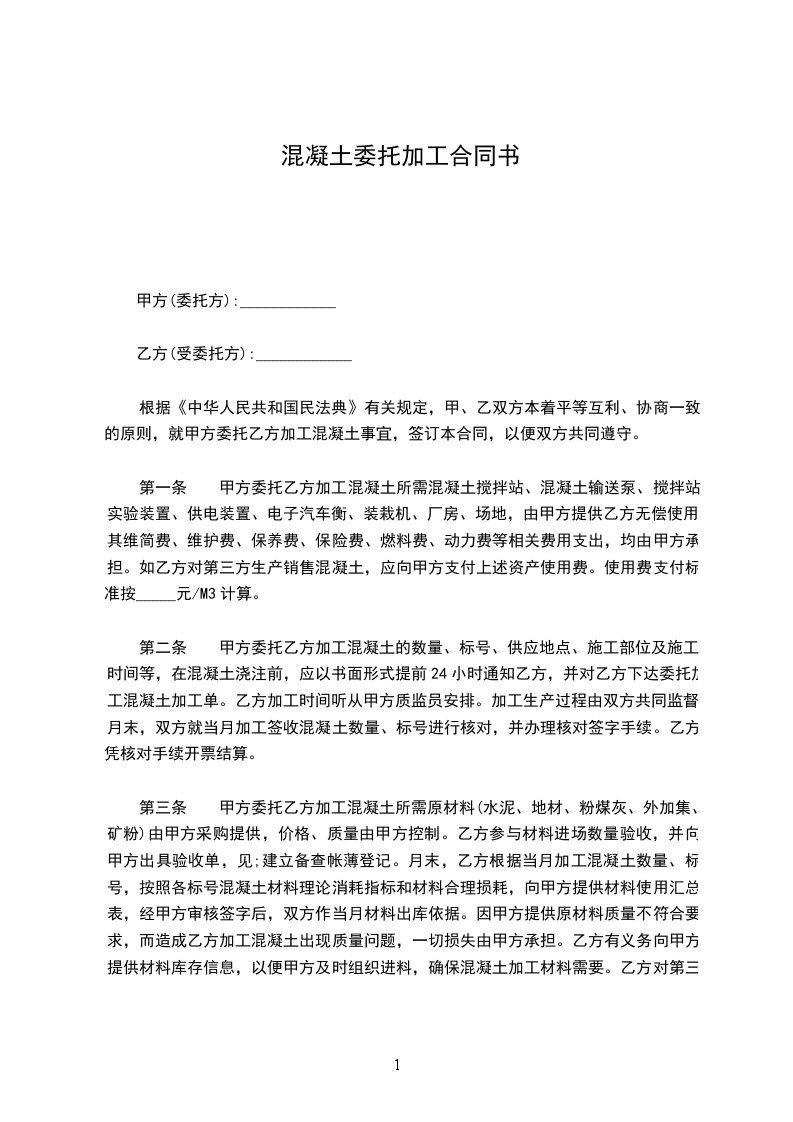 1.加工费用:每立方米混凝土加工费为人民币______元(大写______元整)。此价格为固定单价,不因任何因素调整(除本合同约定的价格调整情形外)。