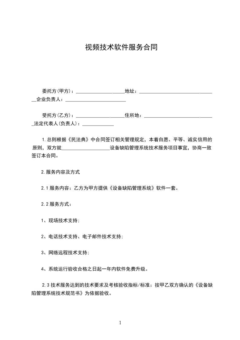 1.总则根据《民法典》中合同签订相关管理规定,本着自愿、平等、诚实信用的原则,双方就____________________设备缺陷管理系统技术服务项目事宜,协商一致,签订本合同。