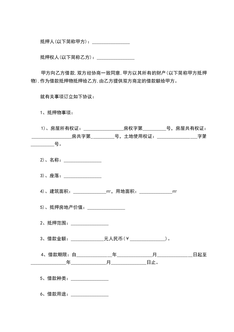 甲方向乙方借款,双方经协商一致同意,甲方以其所有的财产(以下简称甲方抵押物),作为借款抵押物抵押给乙方,由乙方提供双方商定的借款额给甲方。