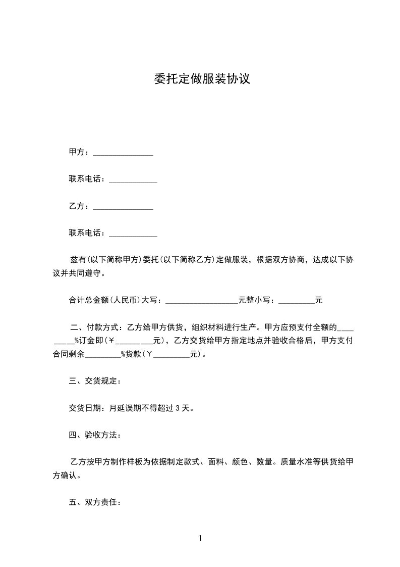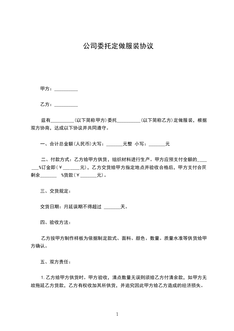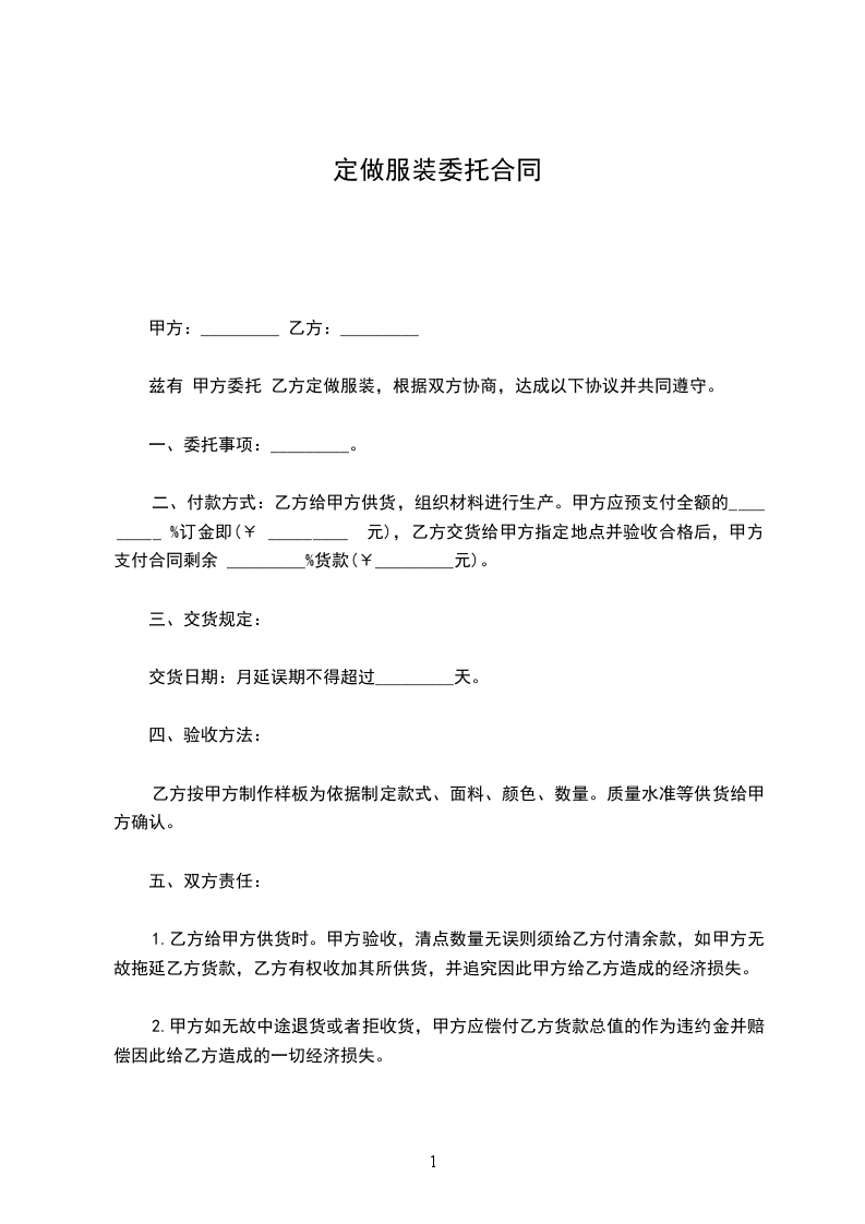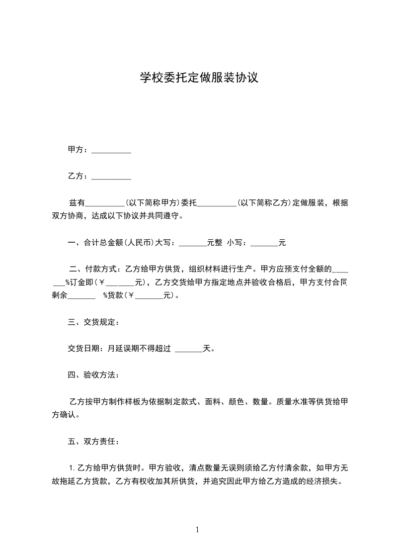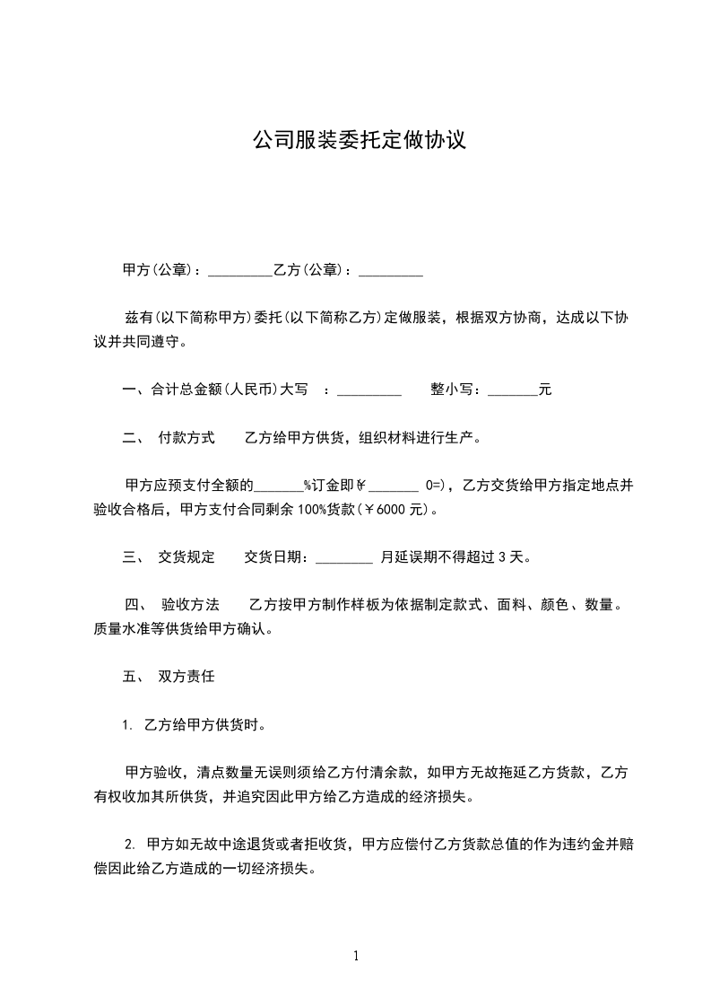 1.定做价格:本合同项下定做服装的总价款为人民币______元(大写:______元整)。此价格为固定总价,包含服装制作、原材料、加工费、运输费、税费等乙方完成本合同约定工作所需的一切费用。