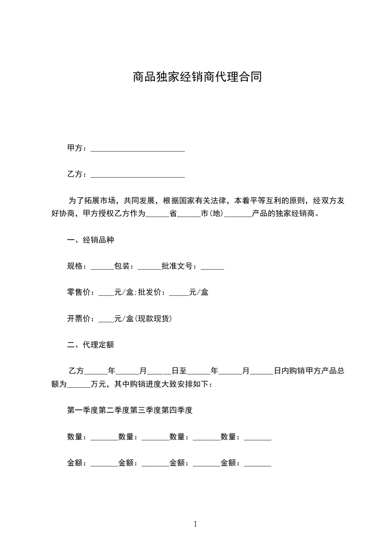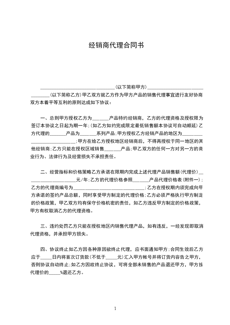 一、总则甲方授权乙方为_______产品特约经销商,乙方的代理资格及授权限为签订本协议之日起为期一年;(如乙方如约完成限定最低销售额本协议可自动顺延)乙方代理的_______产品为_______系列产品;甲方授权乙方经销产品的地区为____________________________;甲方在给乙方授权地区经销商后,不得再授权于同一地区的其他经销商;乙方只能在授权区域销售_______产品;甲乙双方的任何一方对另一方的商业行为、法律行为及经营损失不承担责任。