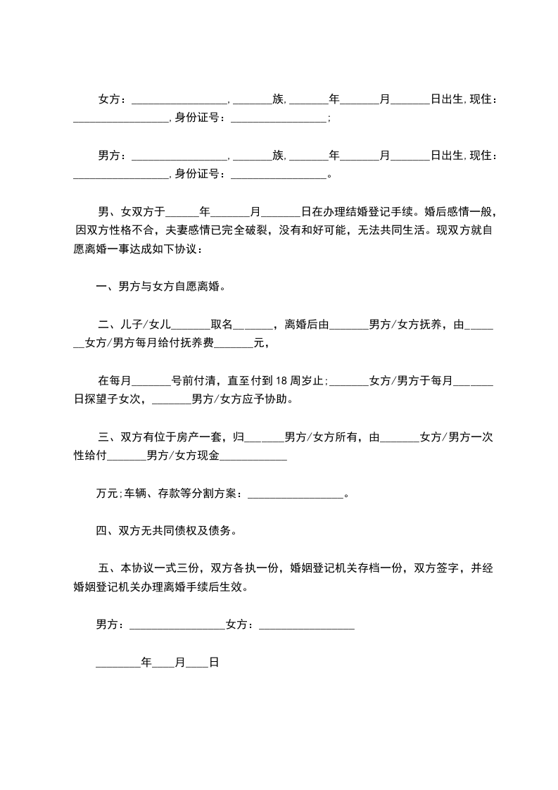 立约人_________与_________于_________年_________月_________日结婚,因_________原因双方自愿同意离婚。