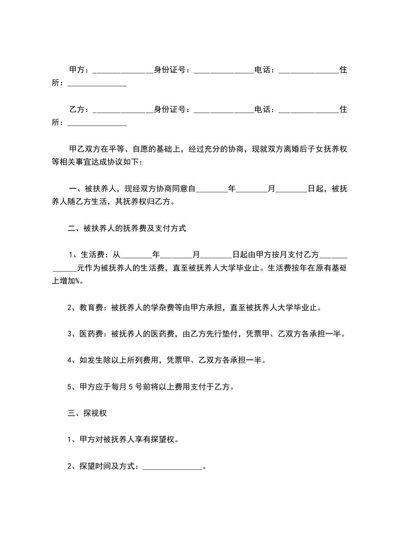 2.母亲_________(或父亲_________)则每月支付抚养费_________元,不承担具体抚养工作。