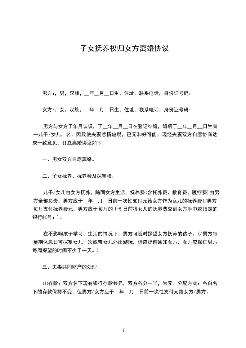 1.儿子/女儿_________由父亲_________(或母亲_________)抚养,直至年满16周岁,其间负责其日常生活、健康和教育等方面的监护。