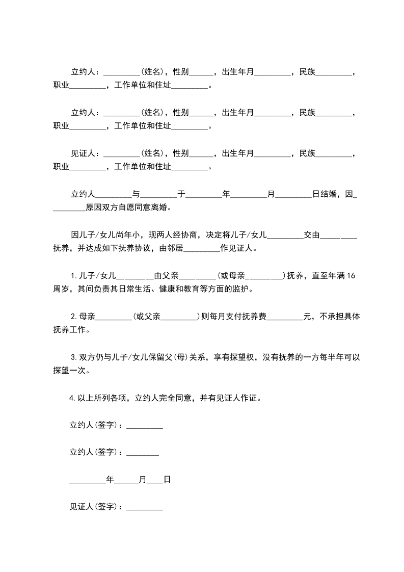 因儿子/女儿尚年小,现两人经协商,决定将儿子/女儿_________交由_________抚养,并达成如下抚养协议,由邻居_________作见证人。