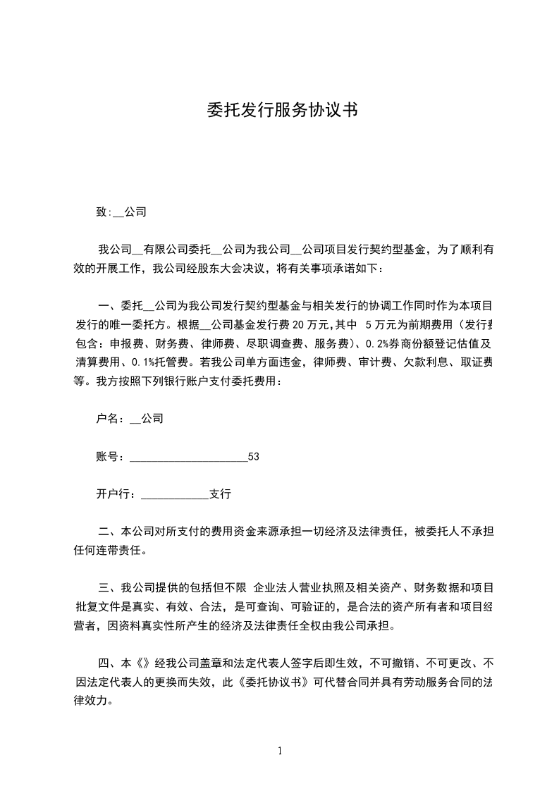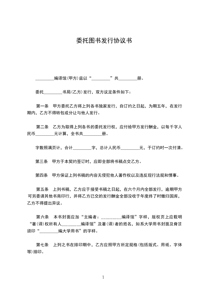 第二条 乙方为取得上列各书的委托发行权,应付给甲方发行酬金,以每千字人民币_________元计算,全书共_________册。