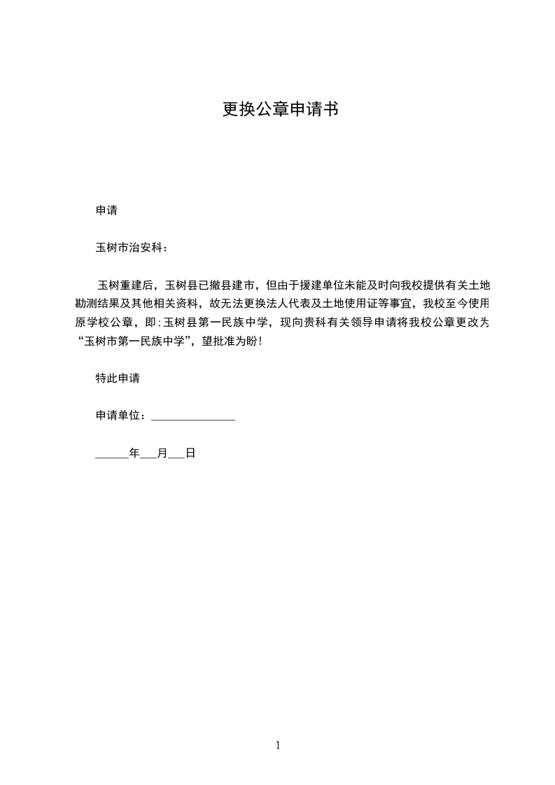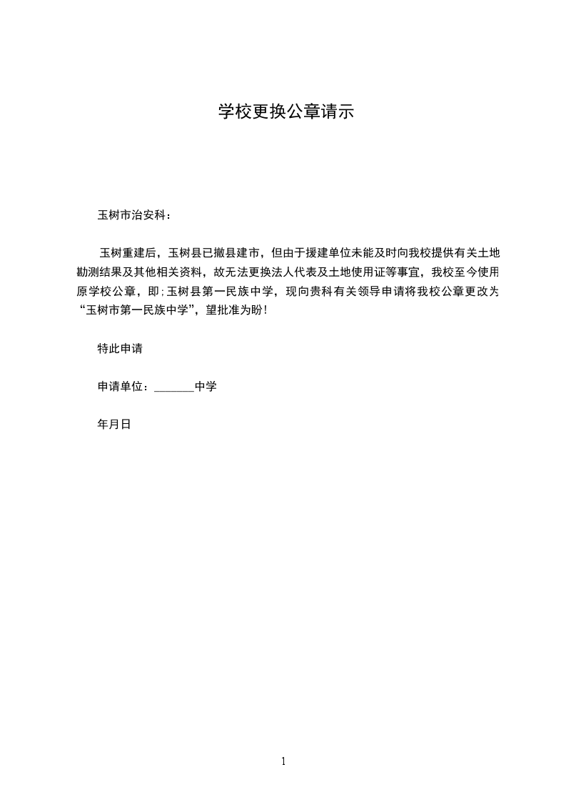 玉树重建后,玉树县已撤县建市,但由于援建单位未能及时向我校提供有关土地勘测结果及其他相关资料,故无法更换法人代表及土地使用证等事宜,我校至今使用原学校公章,即;玉树县第一民族中学,现向贵科有关领导申请将我校公章更改为“玉树市第一民族中学”,望批准为盼!