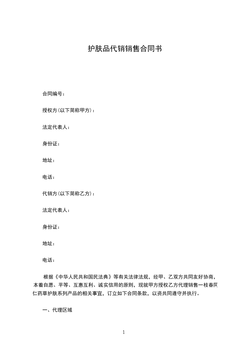 根据《中华人民共和国民法典》等有关法律法规,经甲、乙双方共同友好协商,本着自愿、平等、互惠互利、诚实信用的原则,现就甲方授权乙方代理销售一枝春同仁药草护肤系列产品的相关事宜,订立如下合同条款,以资共同遵守并执行。