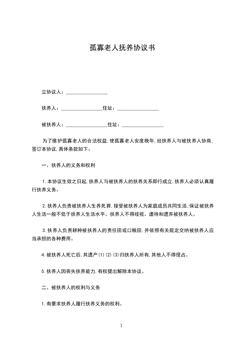 为了维护孤寡老人的合法权益,使孤寡老人安度晚年,经扶养人与被扶养人协商,签订本协议,具体条款如下: