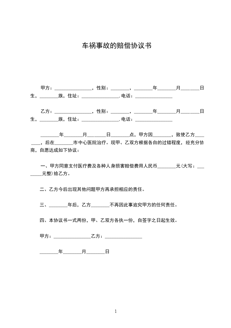 一、甲方自愿赔偿给乙方各项损失共计________元人民币(大写:________整)(不包括已经支付的医药费,交通费等元)。
