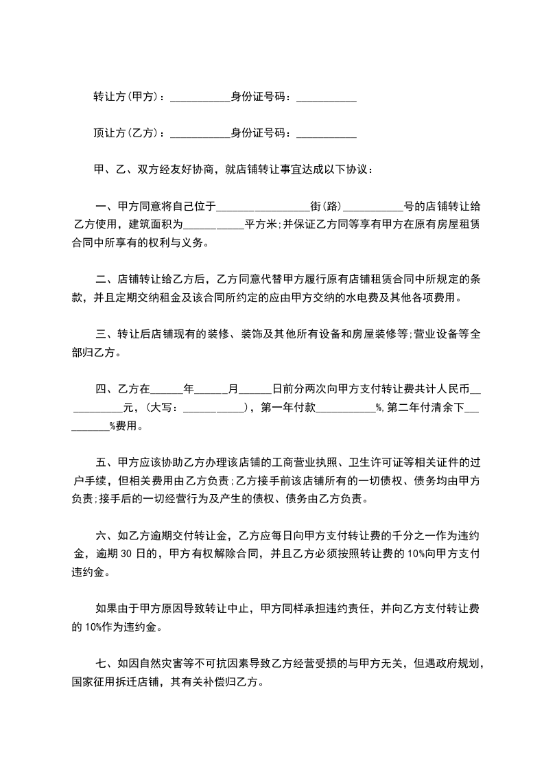 一、甲方同意将自己位于_________________街(路)___________号的店铺转让给乙方使用,建筑面积为___________平方米;并保证乙方同等享有甲方在原有房屋租赁合同中所享有的权利与义务。