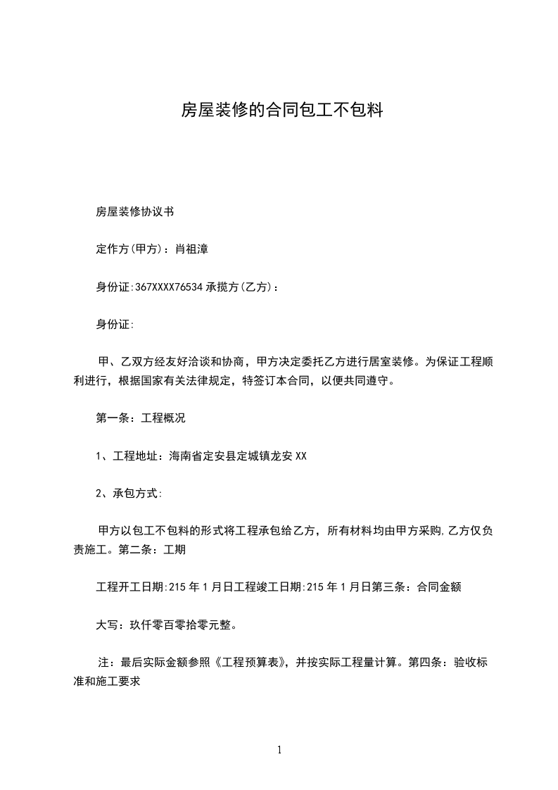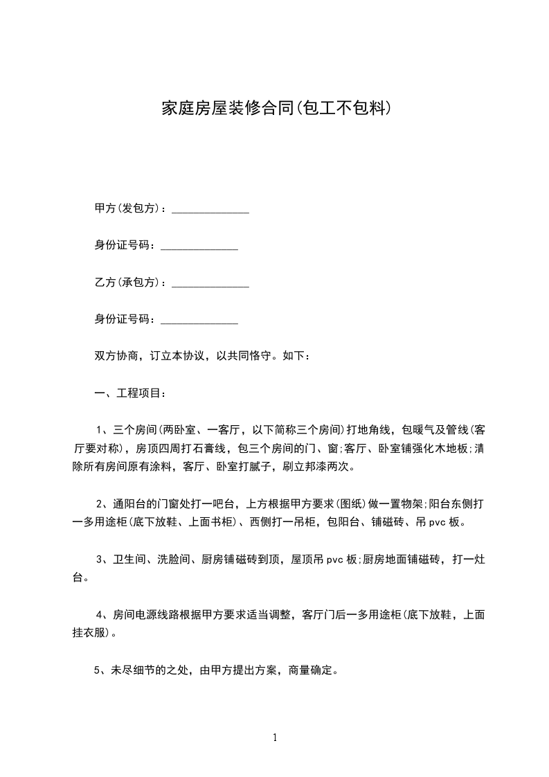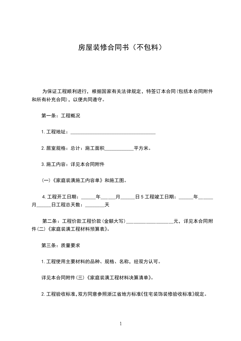 第二条:工程价款工程价款(金额大写)___________________元,详见本合同附件(二)《家庭装潢工程材料预算表》。