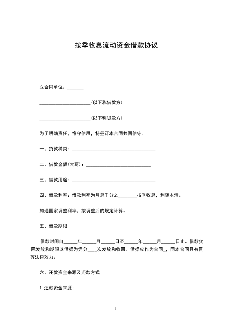 三、借款期限定为__年__月,从发放出贷款之日起至全部收回本息,具体用款和还款的方式和时间,以借据为凭并作为本合同附件。利率月息为__‰,按季收息。贷款逾期未还除限期追收外,按规定从逾期之日起加收利息__%。