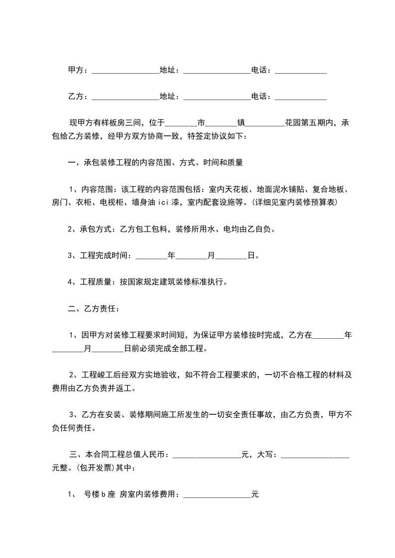 2、承包方式:乙方包工包料,装修所用水、电均由乙自负。