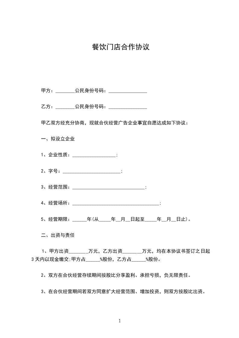 鉴于合伙人各方有意共同投资经营餐饮门店,经友好协商,达成如下合伙协议:
