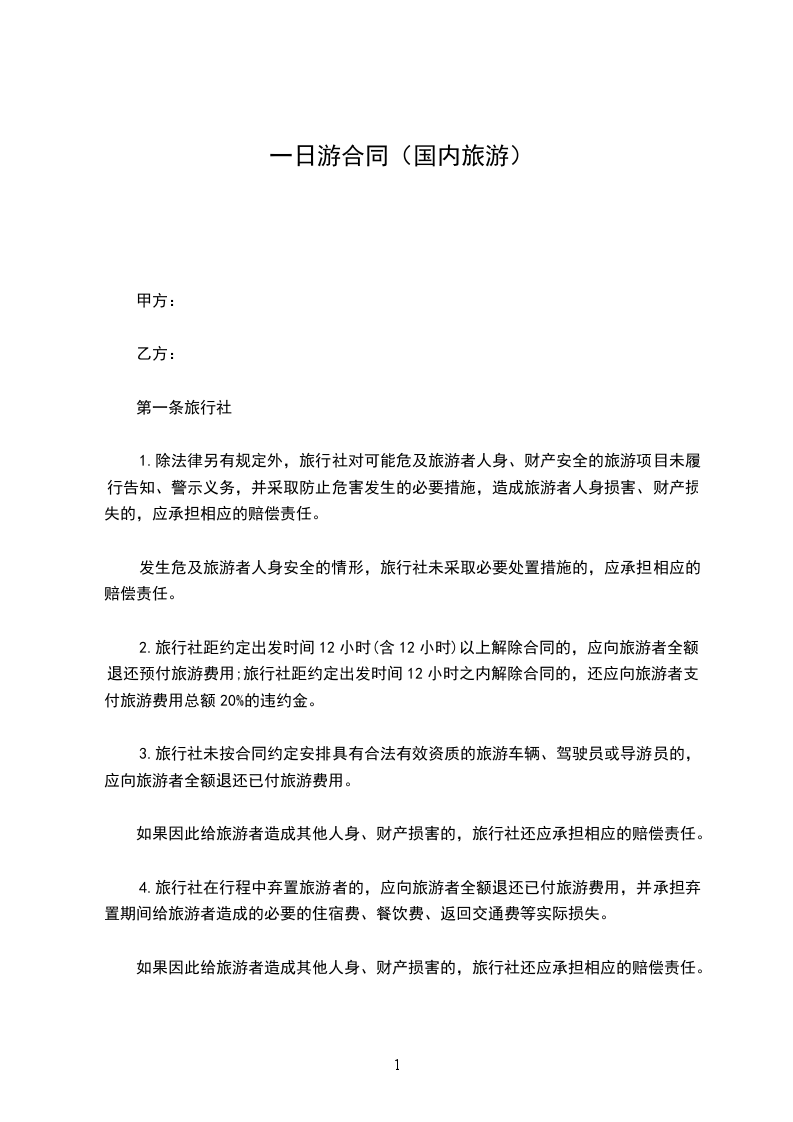 2.旅行社距约定出发时间12小时(含12小时)以上解除合同的,应向旅游者全额退还预付旅游费用;旅行社距约定出发时间12小时之内解除合同的,还应向旅游者支付旅游费用总额20%的违约金。
