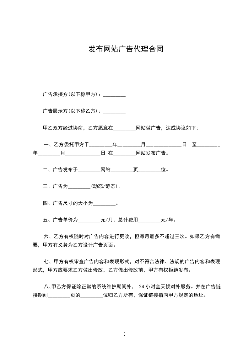 1、价格和折扣甲方在乙方网站广告投放时间_____年_____月_____日至_____年_____月_____日网站首面横幅:投放时间_____年_____月_____日至_____年_____月_____日价格为:元/周__10天共计:元