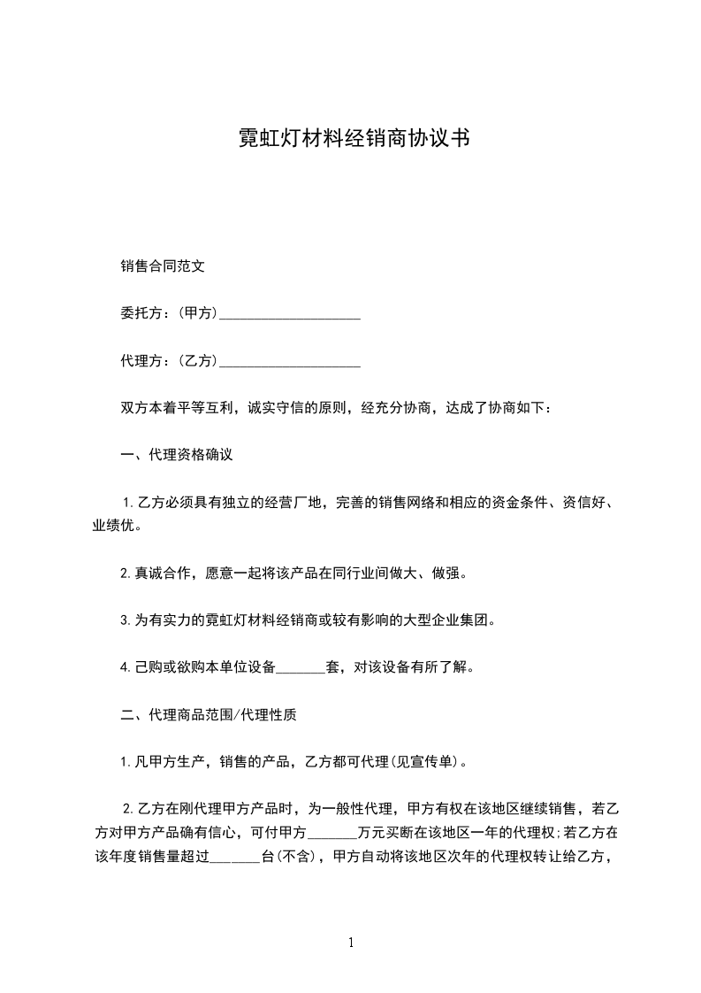 2.乙方在刚代理甲方产品时,为一般性代理,甲方有权在该地区继续销售,若乙方对甲方产品确有信心,可付甲方_______万元买断在该地区一年的代理权;若乙方在该年度销售量超过_______台(不含),甲方自动将该地区次年的代理权转让给乙方,甲方有义务将该地区的客户介绍给乙方,若乙方在年度代理权内未完成_______台,同样,乙方将自动取消在该地区代理转为一般性代理。