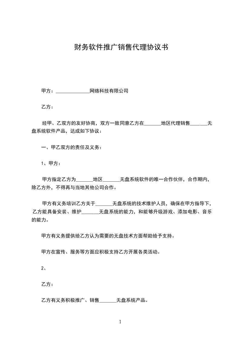 经甲、乙双方的友好协商,双方一致同意乙方在_______地区代理销售_______无盘系统软件产品,达成如下协议:
