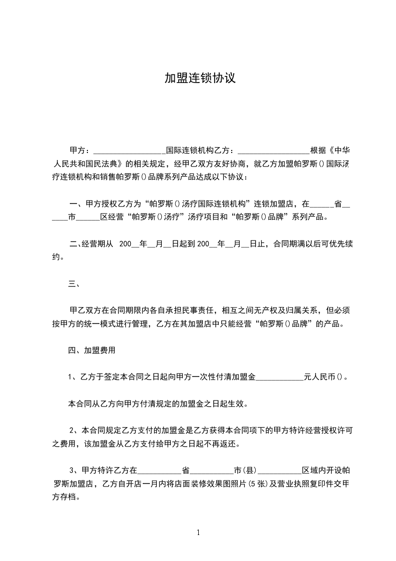 甲方应向乙方支付加盟费用共计人民币______元(大写:______元整)。该费用包括品牌授权费、技术支持费、培训费用等,一经收取不予退还。