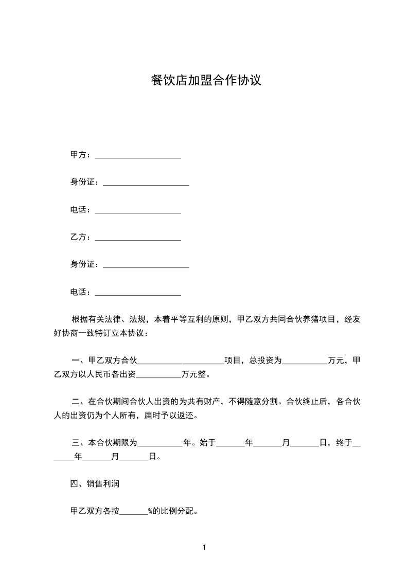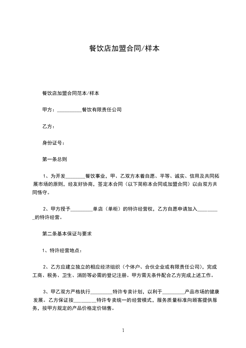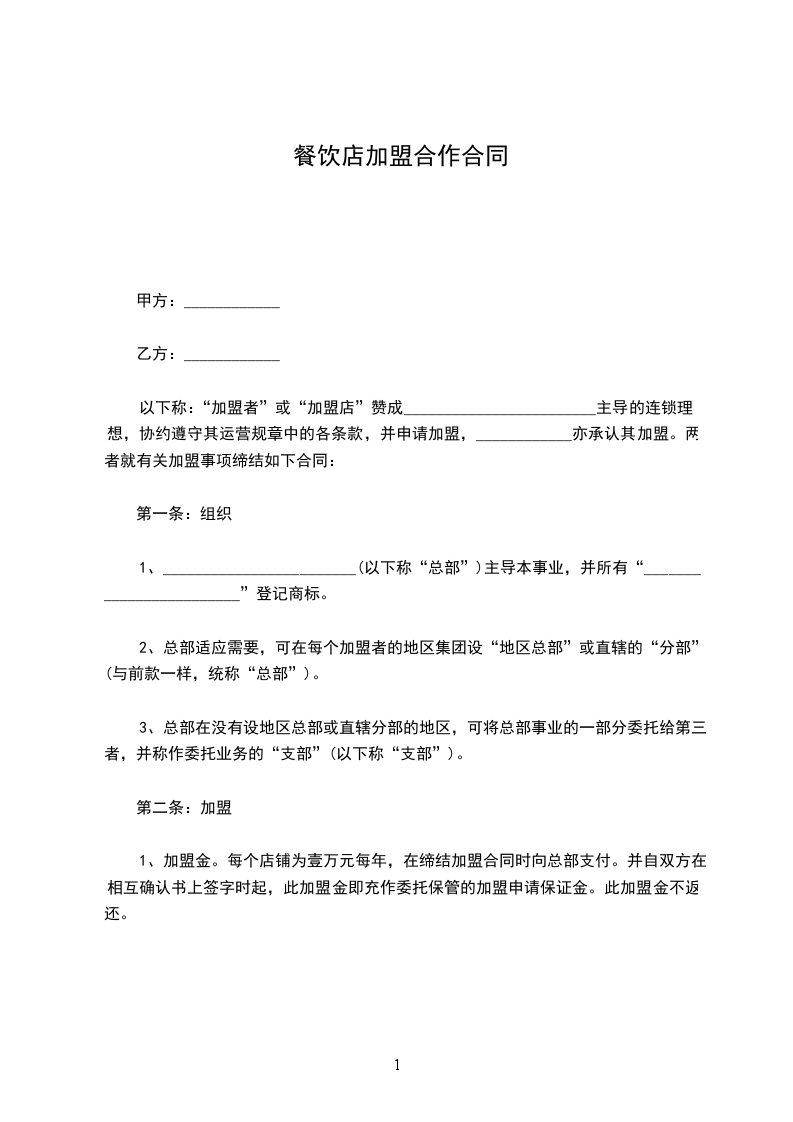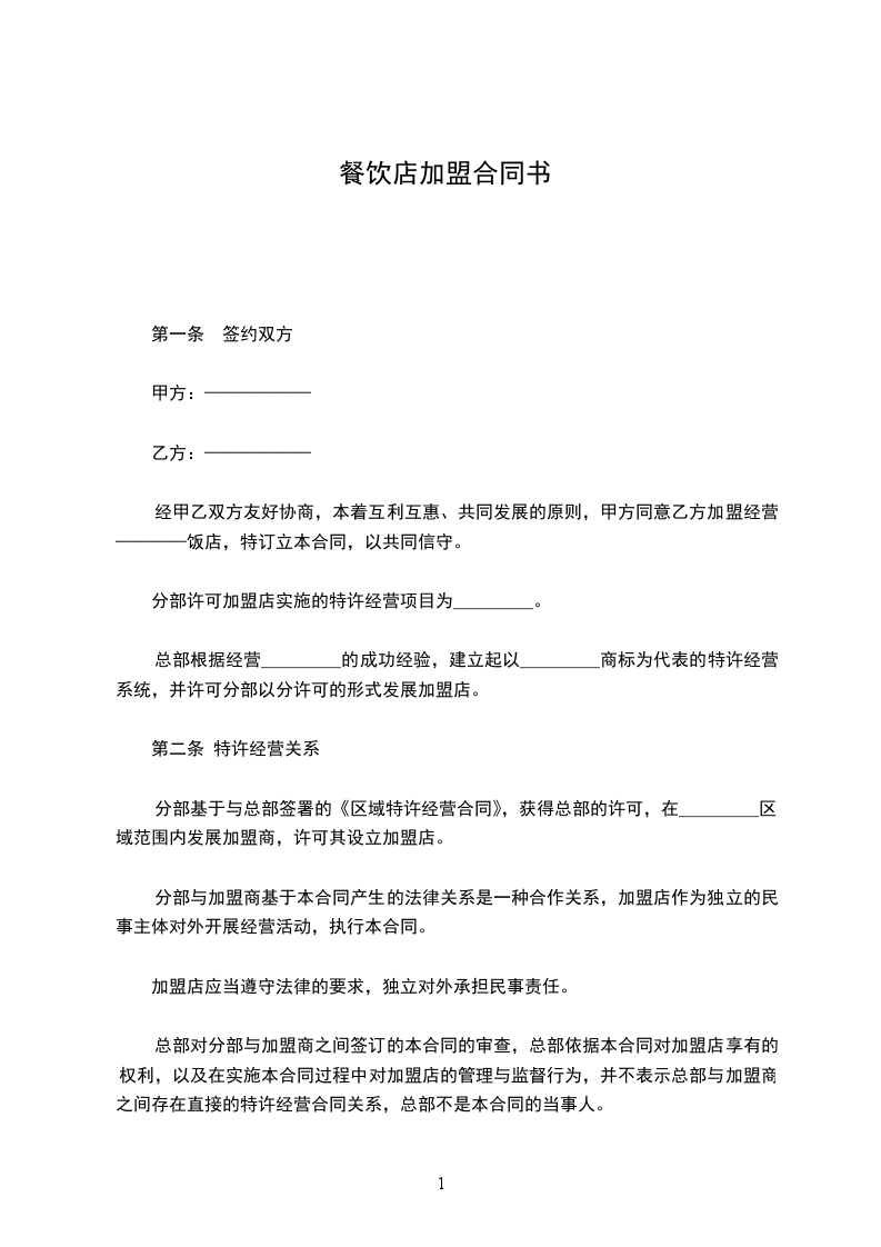 篇1酒店餐饮店加盟合同