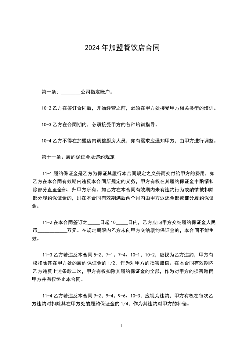 2.乙方需向甲方缴纳品牌保证金人民币______元,用于保证乙方在加盟期间遵守本合同约定。如乙方在合同期满且无违约行为,甲方应在期满后____日内无息退还保证金。