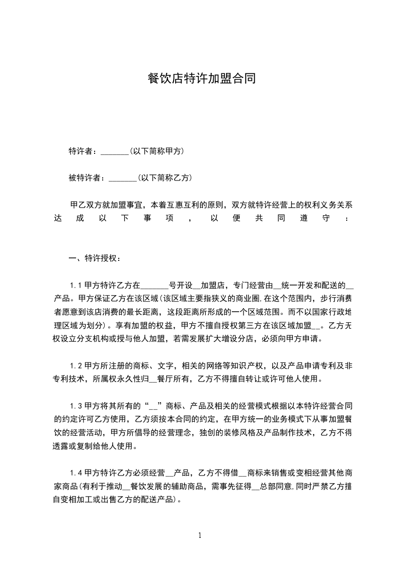 1.乙方授予甲方在[具体地点]开设一家以乙方品牌命名的酒店餐饮店(以下简称“加盟店”)的权利,加盟期限自____年__月__日起至____年__月__日止。