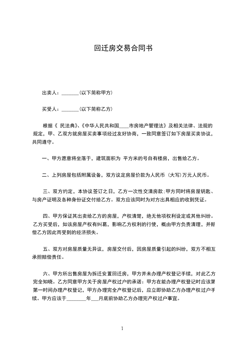 第一条 经甲乙双方协商,乙方___________万元人民币向甲方购买该回迁楼(包括楼上阁楼、___________平仓房)。