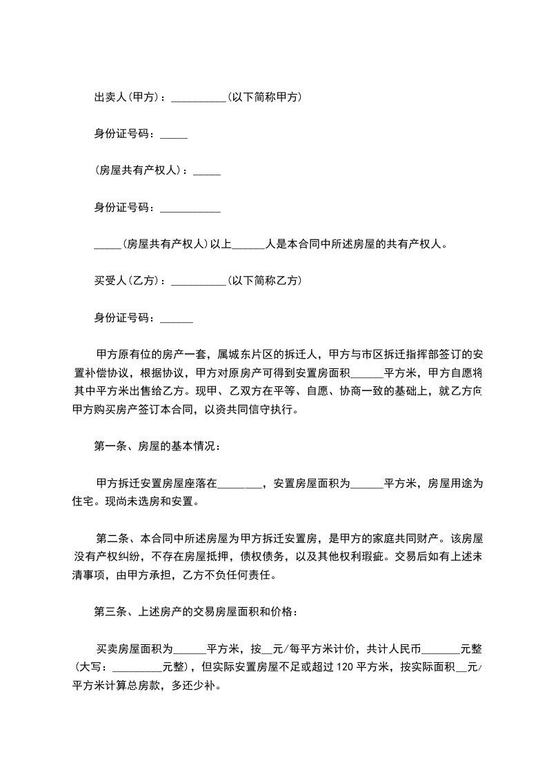 甲方在__________小区有一套回迁楼(包括楼上阁楼、___________平仓房),具体房屋编号为:_______________,面积为___________平方米,门牌号___________,仓房号由___________介绍,乙方同意购买甲方回迁楼(包括),经甲乙双方充分协商本着自愿的原则达成以下协议,具体内容如下: