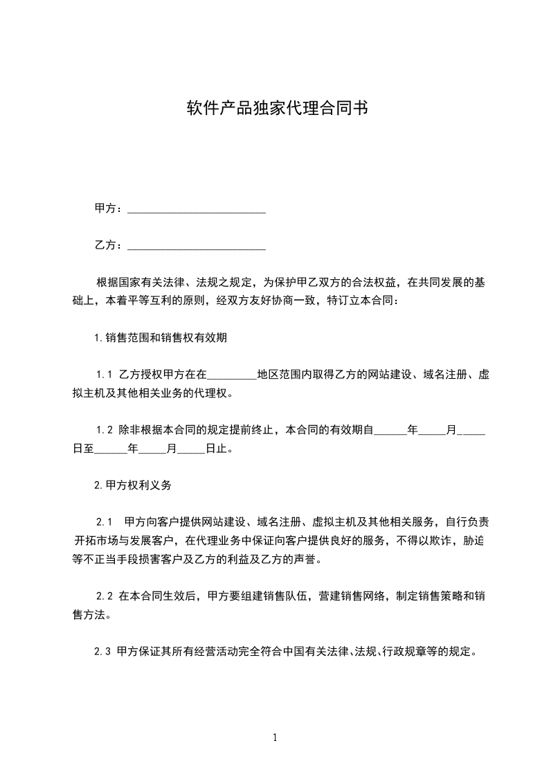 1.1 乙方授权甲方在在_________地区范围内取得乙方的网站建设、域名注册、虚拟主机及其他相关业务的代理权。