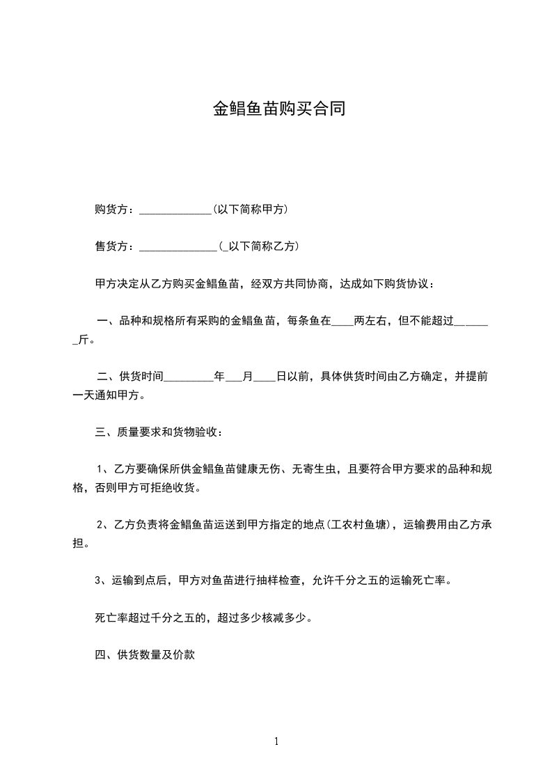 1、乙方要确保所供金鲳鱼苗健康无伤、无寄生虫,且要符合甲方要求的品种和规格,否则甲方可拒绝收货。