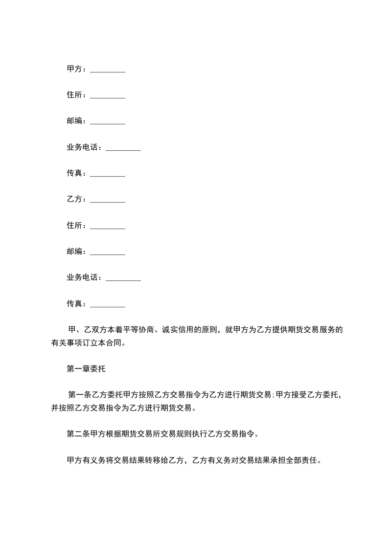 第一条乙方委托甲方按照乙方交易指令为乙方进行期货交易;甲方接受乙方委托,并按照乙方交易指令为乙方进行期货交易。