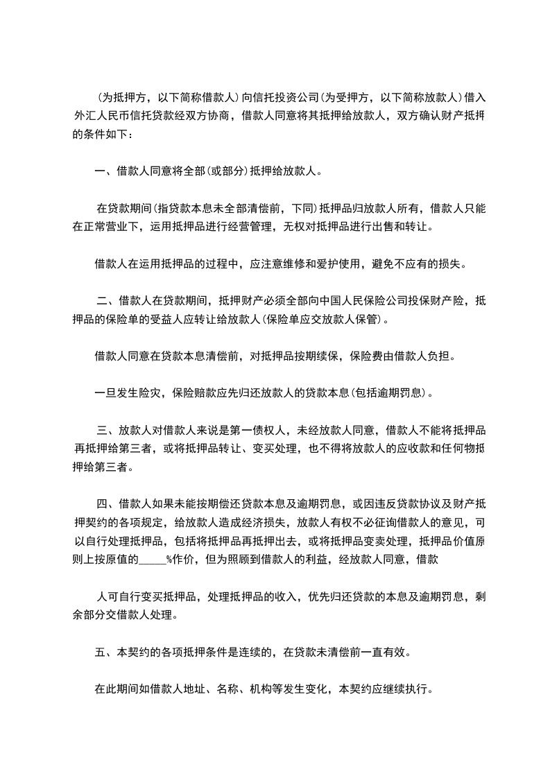 (为抵押方,以下简称借款人)向信托投资公司(为受押方,以下简称放款人)借入外汇人民币信托贷款经双方协商,借款人同意将其抵押给放款人,双方确认财产抵押的条件如下: