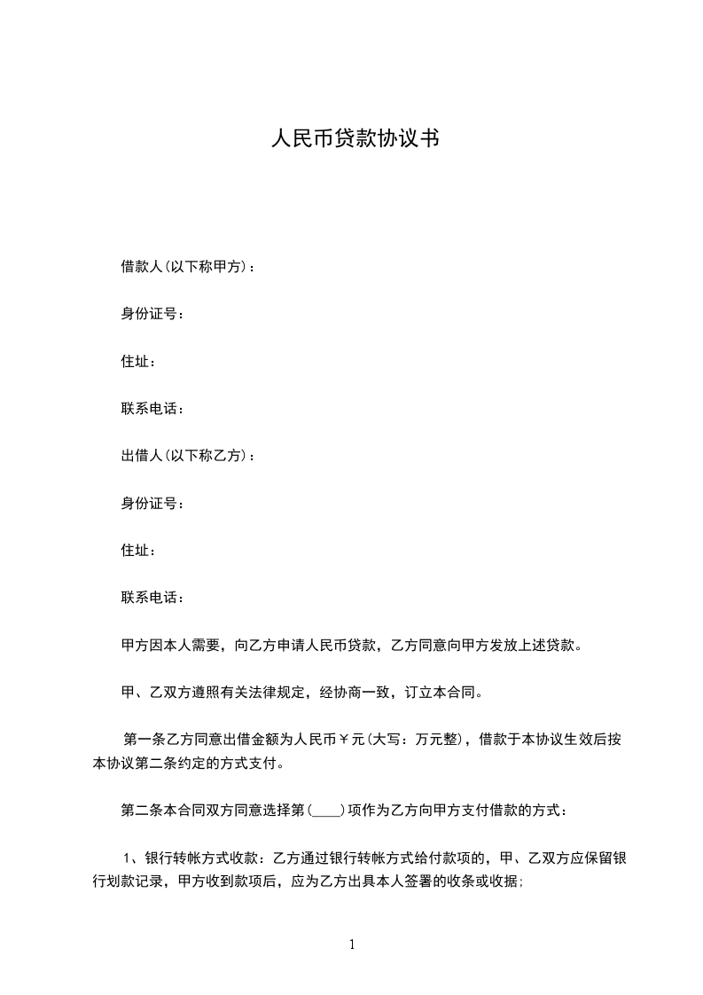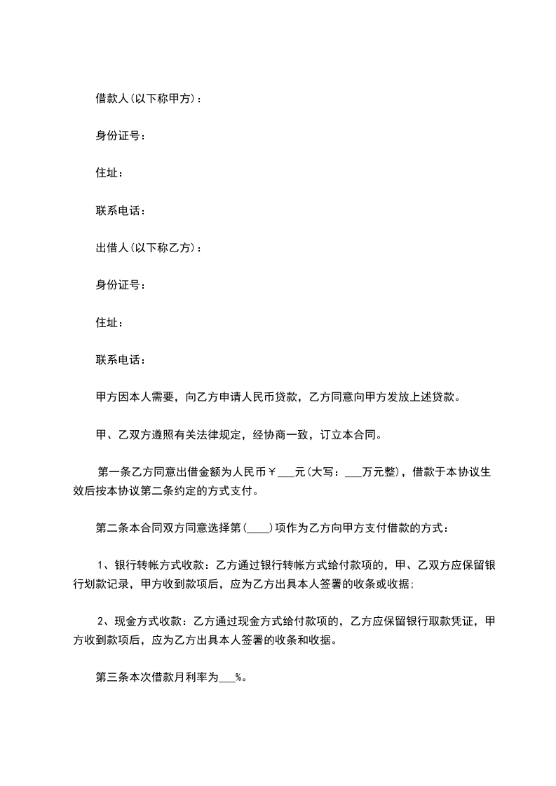 第一条乙方同意出借金额为人民币¥元(大写:万元整),借款于本协议生效后按本协议第二条约定的方式支付。