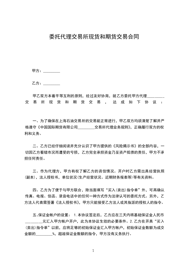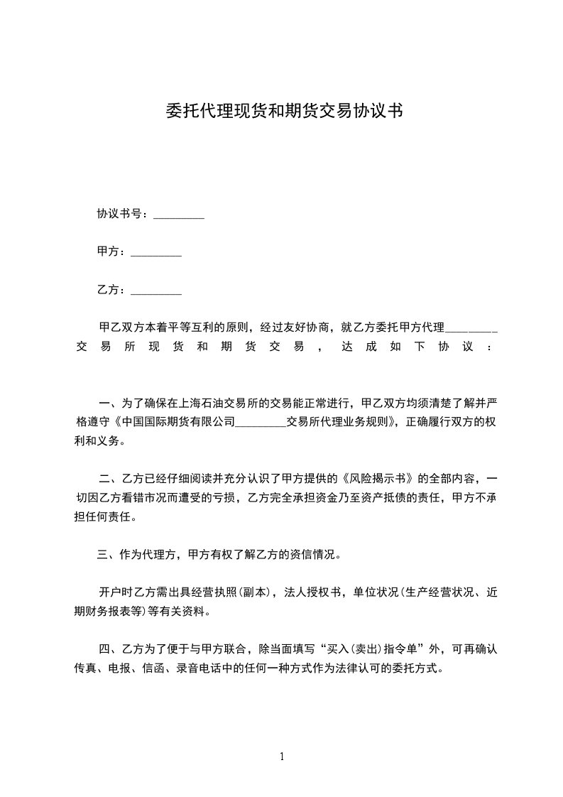 甲乙双方本着平等互利的原则,经过友好协商,就乙方委托甲方代理_________交易所现货和期货交易,达成如下协议: