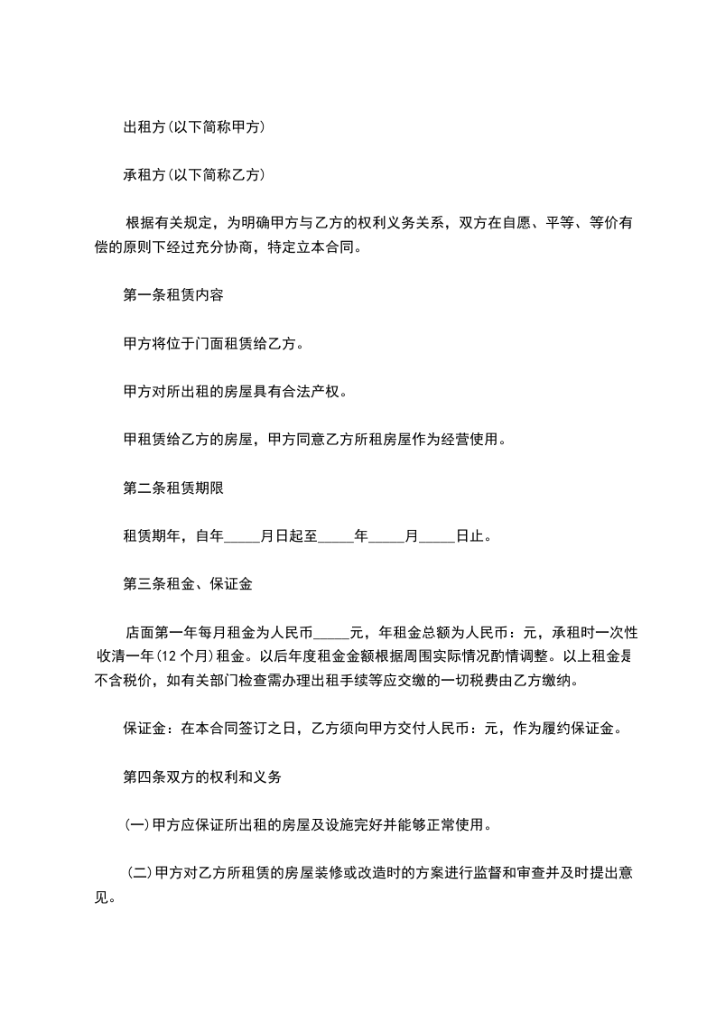 店面第一年每月租金为人民币_____元,年租金总额为人民币:元,承租时一次性收清一年(12个月)租金。以后年度租金金额根据周围实际情况酌情调整。以上租金是不含税价,如有关部门检查需办理出租手续等应交缴的一切税费由乙方缴纳。
